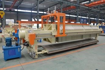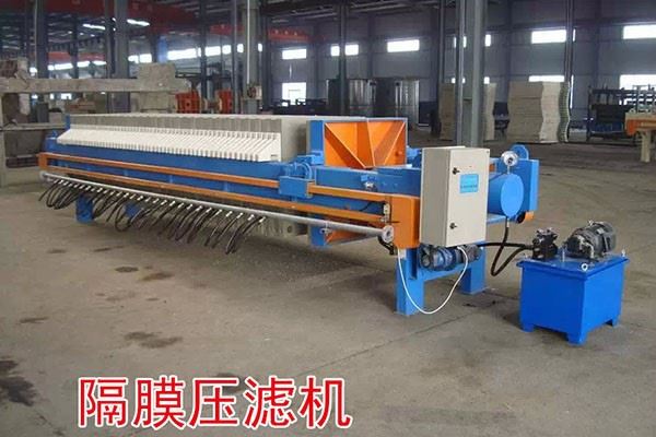 隔膜壓濾機(jī),隔膜壓榨壓濾機(jī)由隔膜板和廂式濾板排列組成濾室,在輸料泵的壓力作用下將漿料輸入濾室,通過過濾介質(zhì)(濾布)將濾料中的固體和液體分離,當(dāng)漿料中的固體形成餅后,再向隔膜通入空氣,對濾室內(nèi)的固體充分壓榨,降低含水率。對于粘性物料的過濾及對含水率要求較高的用戶,此機(jī)更有其獨特的特性。